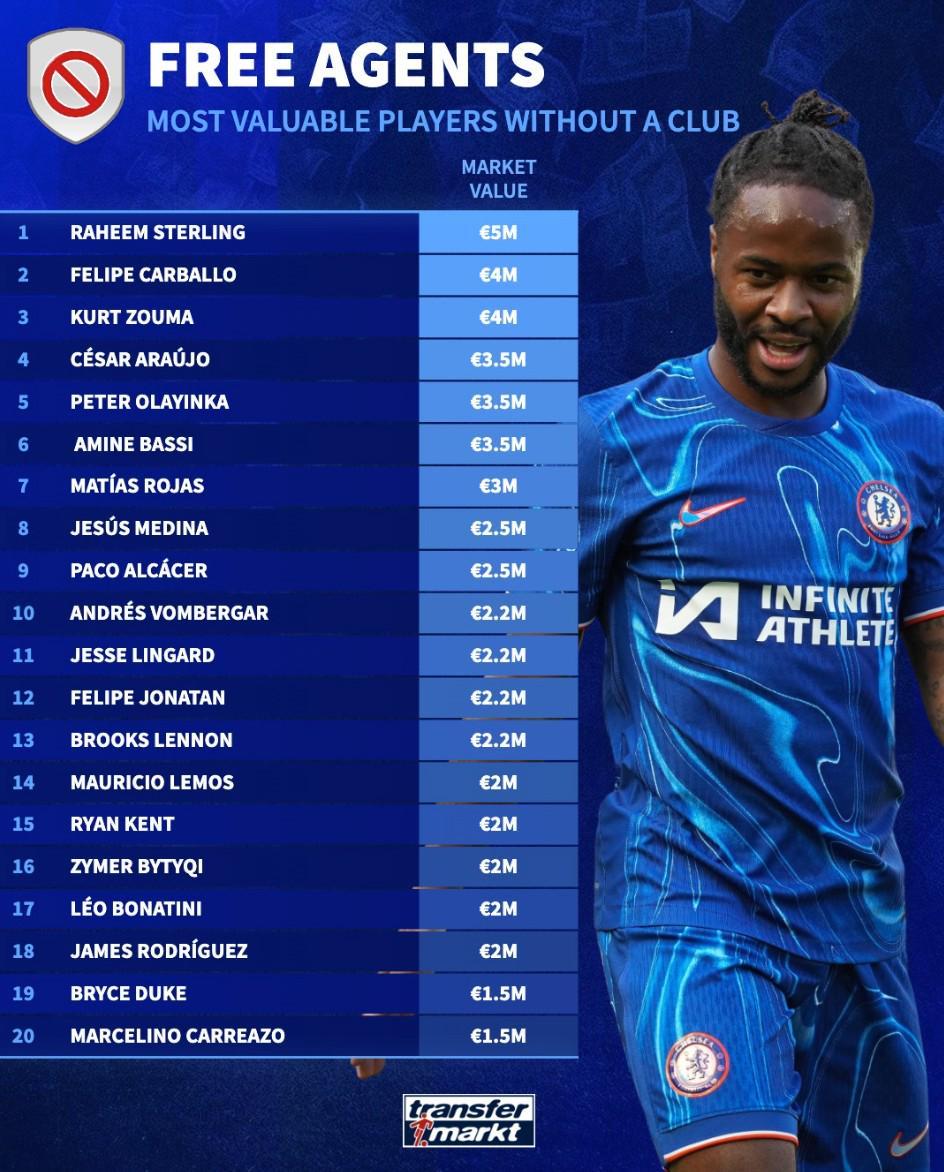 北京时间2月6日,德转统计出了目前身价最高的15名自由球员,斯特林以500万欧元排名第一,祖马、帕科、林加德以及哈梅斯-罗德里格斯上榜。