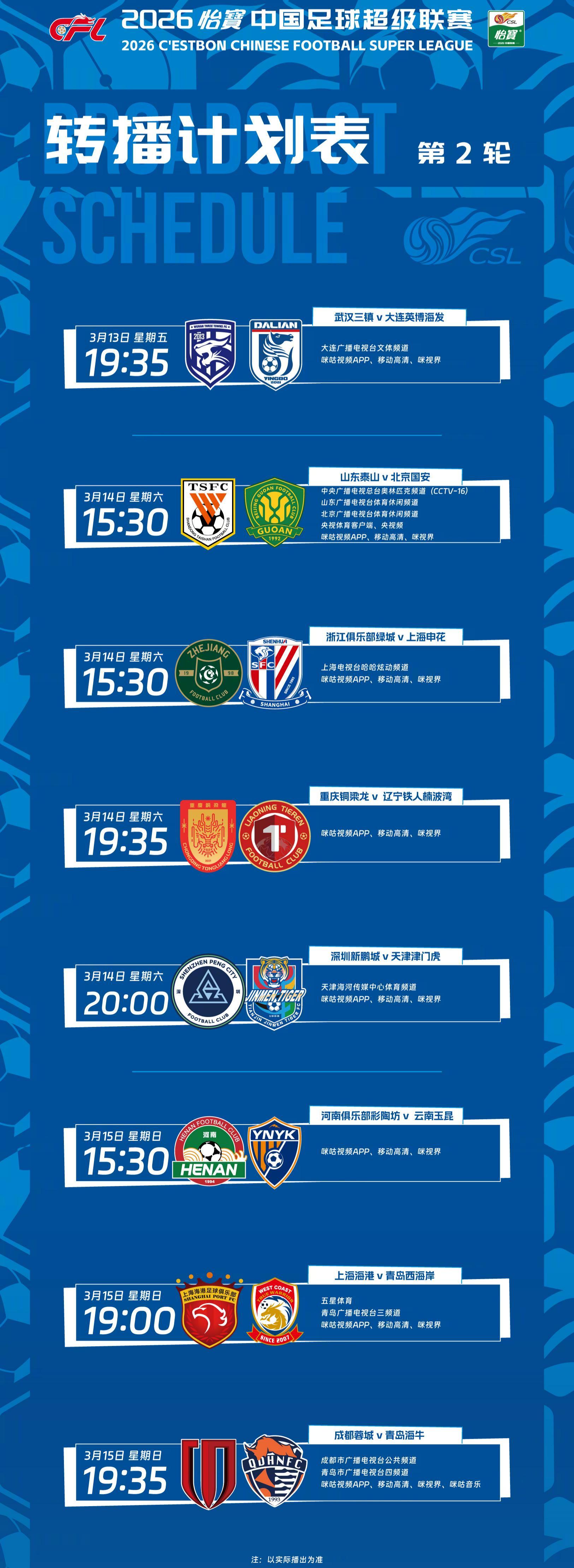 3月13日至15日,2026赛季中超联赛将展开第2轮争夺。赛前,中超官方发布了本轮转播计划表。根据转播计划,本轮8场比赛都有网络平台直播,6场比赛还有电视平台直播。